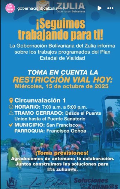 La Gobernación del Zulia anunció la mañana de este miércoles 15 de octubre que habrá restricción vial en la Circunvalación 1.