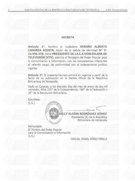 Mediante Gaceta Oficial, Delcy Rodríguez designó al periodista Hernán Canorea como nuevo presidente de Venezolana de Televisión (VTV), en sustitución de Freddy Ñáñez que ocupaba esa posición en conjunto con el Ministerio de Comunicación e Información hasta que fue cambiado al de Ecosocialismo la semana anterior.