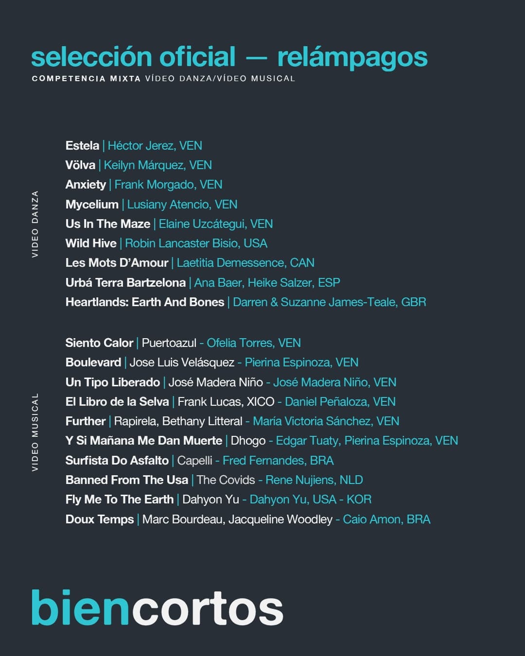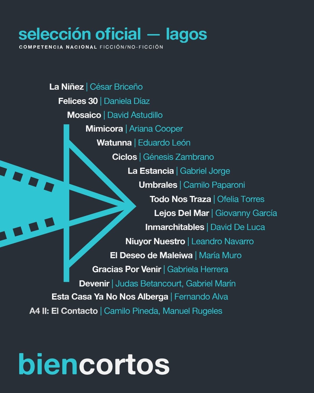 El festival contará con 50 producciones en tres categorías. La sección Lagos la conforman las producciones de ficción y no ficción en escala nacional. La sección Puentes la integran cortometrajes internacionales de ficción y no ficción. La sección Relámpagos está constituida por video danzas, videoclips y videos no experimentales nacionales e internacionales.