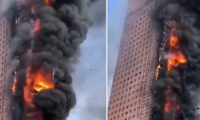 Las impresionantes imágenes difundidas por la televisión estatal CCTV mostraban llamas inmensas de color naranja arrasando todo un costado del edificio, que tiene 42 plantas en la superficie.