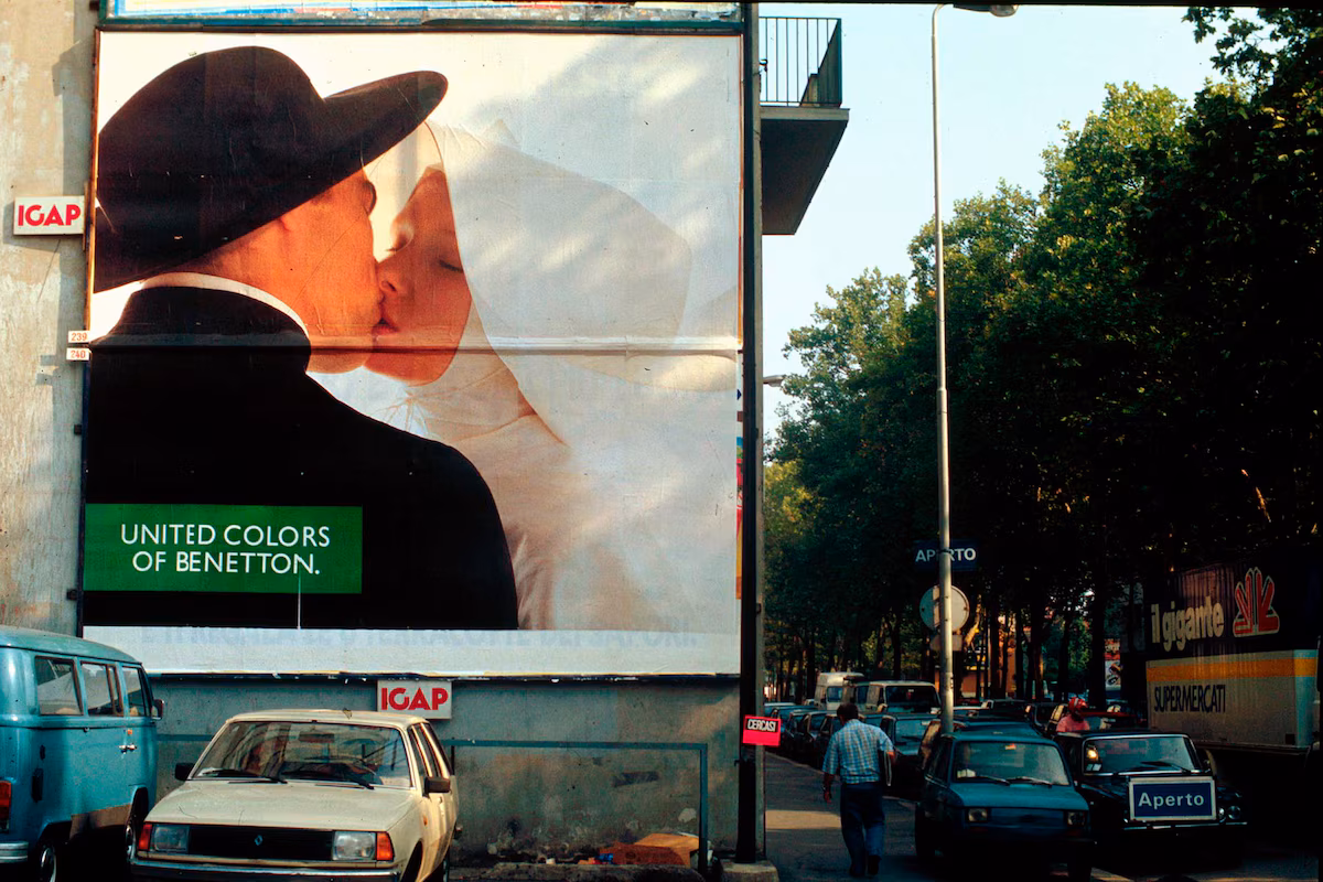 Durante su trabajo como director creativo de la compañía en casi dos décadas (1982-2000), Toscani ideó campañas publicitarias originales y provocadoras que desafiaron las normas de la publicidad, con icónicas fotografias como las de un cura y una monja que se besaban o una mujer negra que daba al pecho a un niño blanco.