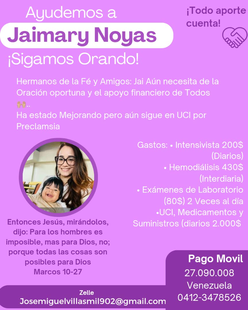 El señor Noyas comentó que ellos deben “llevar la máquina (de diálisis) a la clínica” Zulia, que tiene un costo de 430 dólares, sumando el equipo y honorarios médicos, que, aunado a los gastos médicos de tener a su hija en UCI, sobrepasan las posibilidades económicas de la familia para atender la salud de Jaimary.