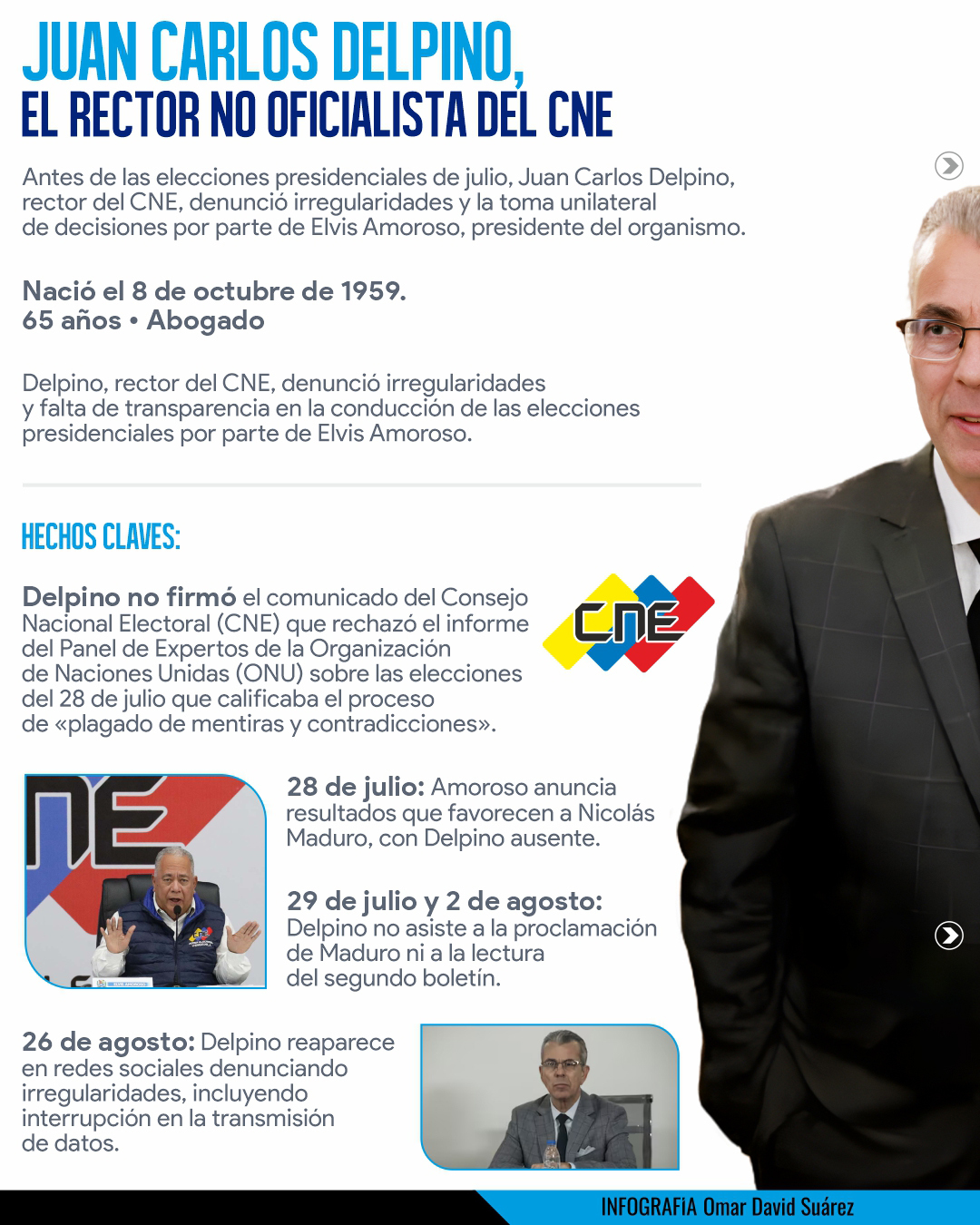 Delpino tampoco asistió al acto de proclamación de Nicolás Maduro como presidente electo el 29 de julio, ni a la lectura del segundo boletín electoral el pasado 2 de agosto, y su nombre estuvo ausente en la firma del comunicado del CNE que rechazó el informe del Panel de Expertos de la Organización de Naciones Unidas (ONU) sobre las elecciones del 28 de julio, calificándolo de “plagado de mentiras y contradicciones”.