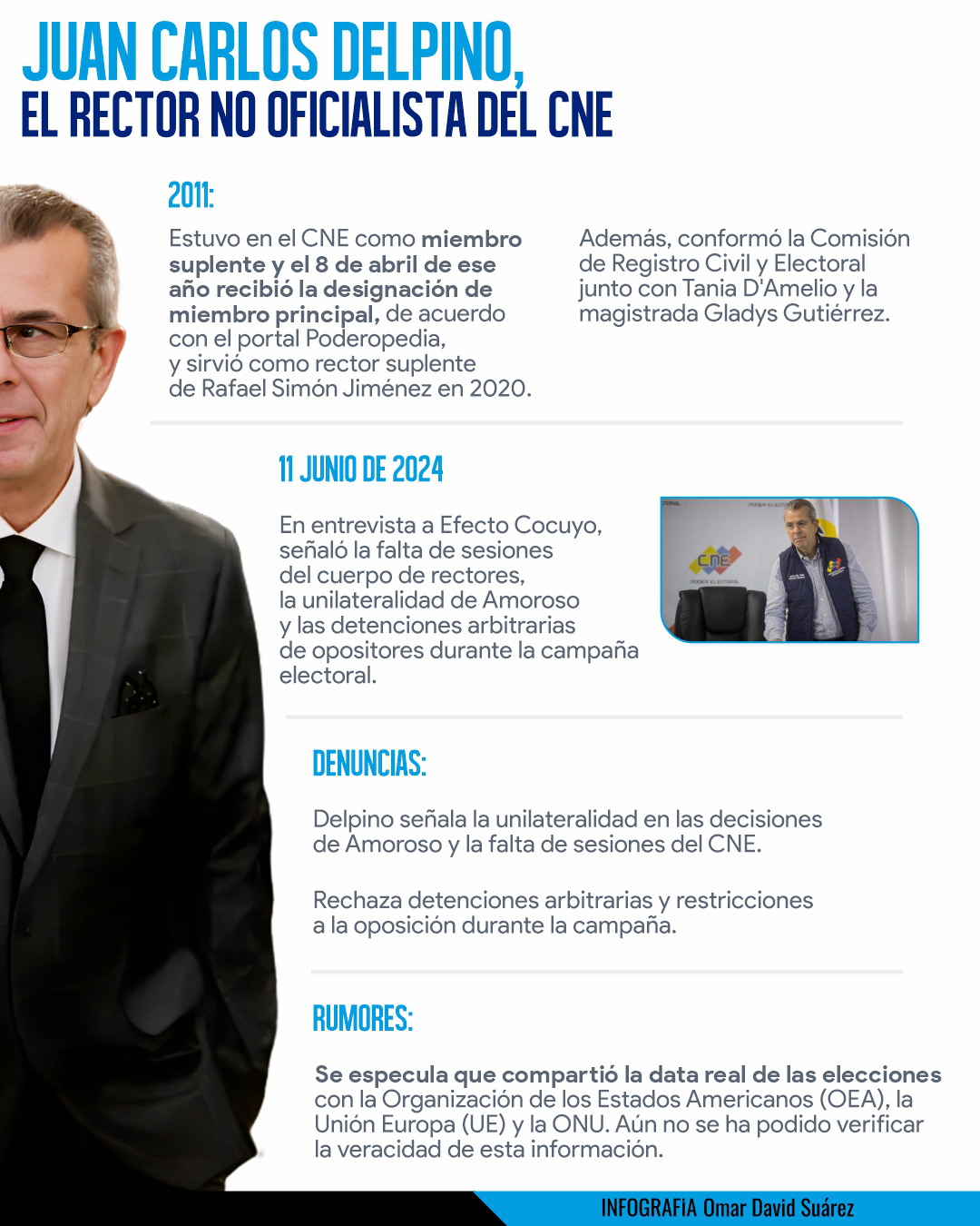 El nombre de este rector volvió a la palestra no sólo por la carta publicada el 26: desde mediados de agosto comenzó a circular el rumor según el cual Delpino “descargó” la presunta data real de las elecciones presidenciales y que la habría compartido con autoridades de la Organización de los Estados Americanos (OEA), la Unión Europa (UE) y la ONU.
