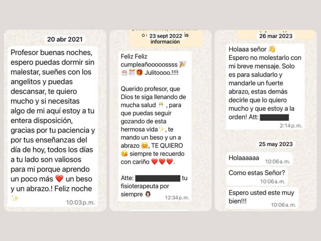 En uno de los mensajes del 20 de abril de 2021 que atribuye a sus trabajadores se lee: “Profesor buenas noches, espero puedas dormir sin malestar, sueñes con los angelitos y puedas descansar, te quiero mucho y si necesitas algo de mi aquí estoy a tu entera disposición, gracias por tu paciencia y tus enseñanzas del día de hoy, todos los días a tu lado son valiosos para mí porque aprendo un poco más (añade un corazón) un beso y un abrazo!. Feliz noche”.