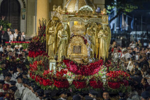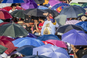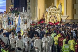 Minutos después de la Bajada, los Servidores de María elevaron la sagrada tablita sobre sus hombros e iniciaron la procesión por la plazoleta y las calles adyacentes del centro marabino.