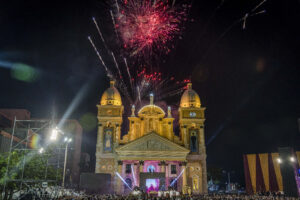 El esperado momento estuvo acompañado por gaitas, aplausos, luces y fuegos artificiales, marcando el reencuentro de la Virgen Morena con su pueblo, que colmó la Calle Derecha y los alrededores de la Basílica.