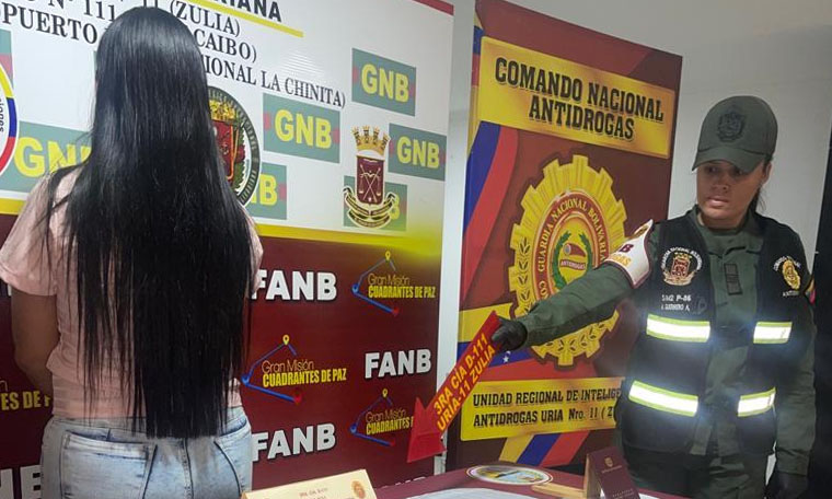Efectivos de la Guardia Nacional Bolivariana (GNB) detuvieron este domingo a una mujer colombiana en el Aeropuerto Internacional La Chinita, en San Francisco, por intentar trasladar 3,51 kilos de cocaína a Panamá.