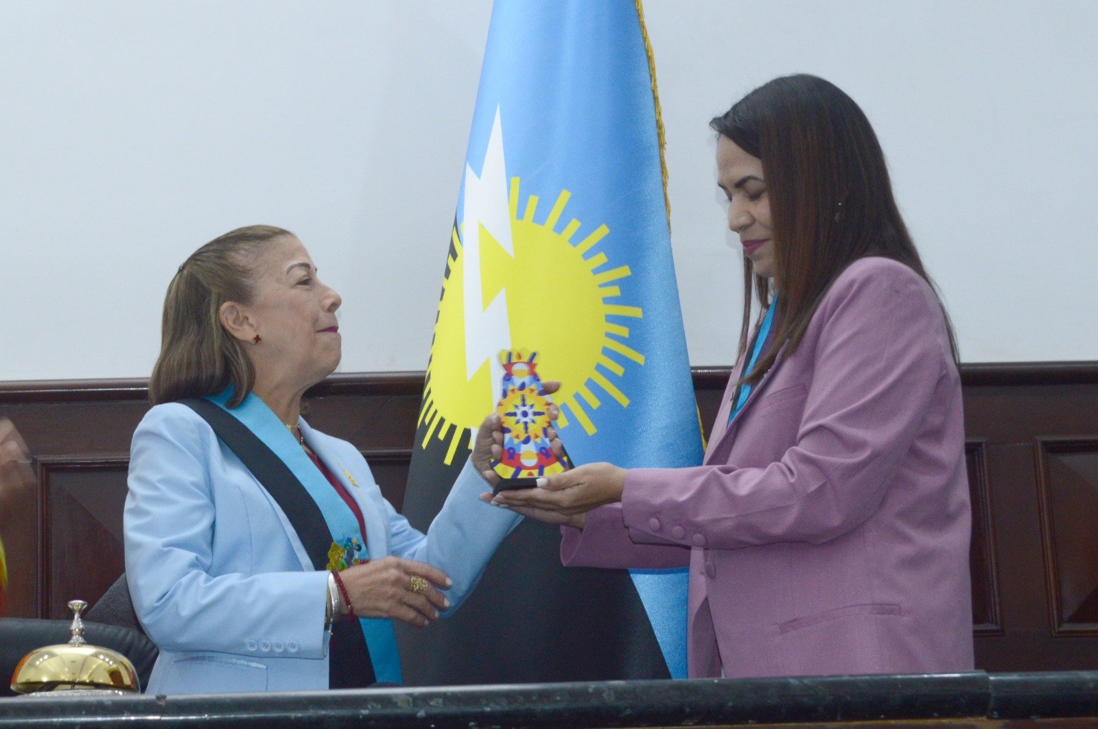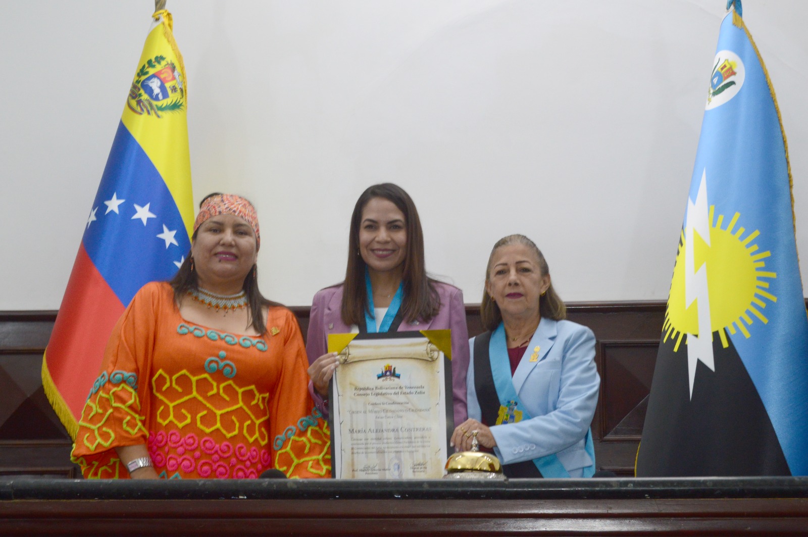 Mediante una sesión solemne, María Alejandra Contreras, presidenta de la Ucez, obtuvo el reconocimiento de manos de la presidenta del Parlamento zuliano, Magdely Valbuena.