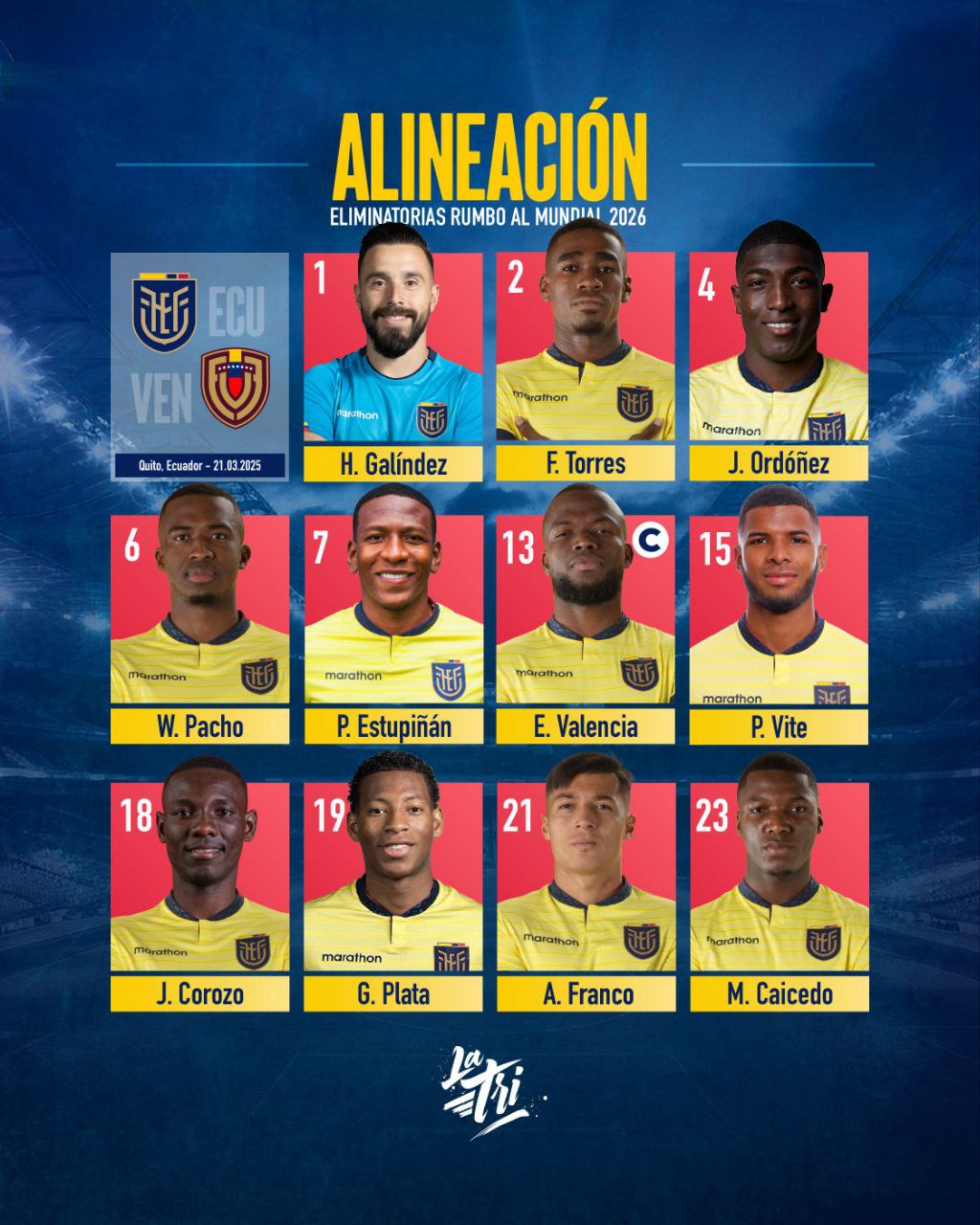 Por su parte, en la “Tricolor”, Hernán Galíndez defenderá el arco, la línea defensiva estará compuesta por Joel Ordóñez, Félix Torres Caicedo, William Pacho y Pervis Estupiñán, el centro del campo será controlado por Gonzalo Plata, Moisés Caicedo, Alan Franco, Pedro Vite y Janner Corozo, con Enner Valencia en la delantera.