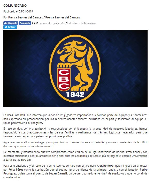 Los Leones del Caracas se pronuncian tras las salida de los jugadores Logan Darnell, Craig Stem, y el cubano Féliz Pérez y anuncian la inclusión en el roster de Alex Romero y Pedro Rodríguez para la ronda final de la LVBP