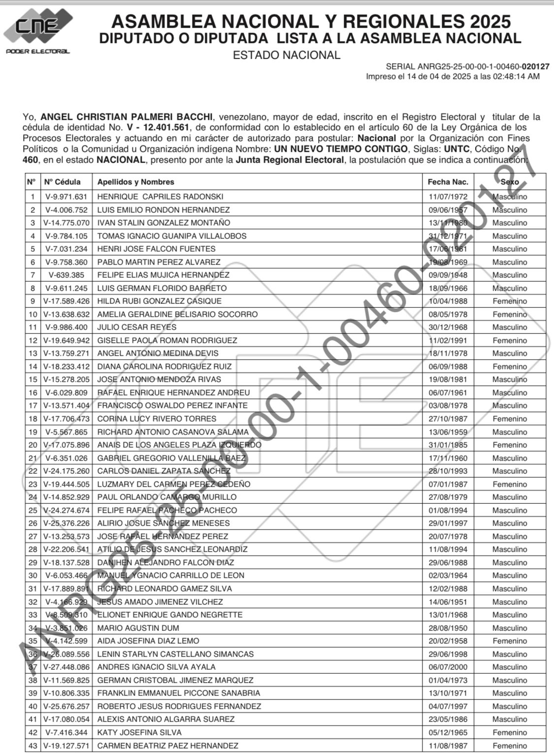 En la lista destacan principalmente los nombres del excandidato presidencial y exgobernador de Miranda, quien la encabeza, seguido por el vicepresidente ejecutivo de UNT, Luis Emilio Rondón; Iván Stalin González y el marabino Tomás Guanipa.