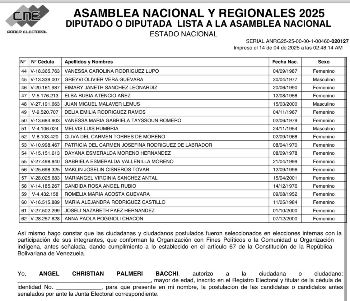 El listado fue presuntamente postulado por el abogado y político Angelo Palmieri, quien funge como secretario de organización nacional de la tolda azul y su representante ante el Consejo Nacional Electoral.