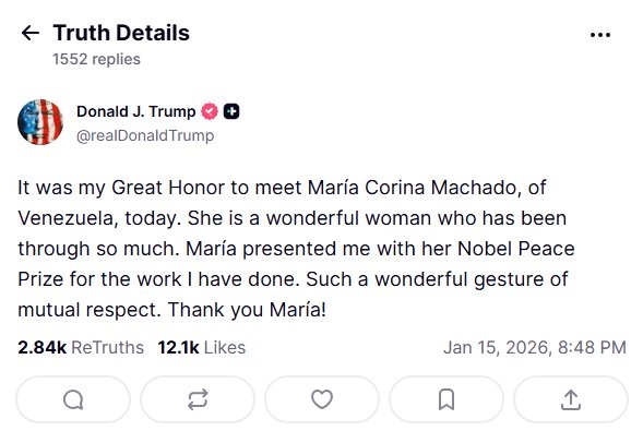 El republicano calificó en Truth Social a Machado como “una mujer maravillosa que ha pasado por muchísimo” y agradeció el obsequio de la medalla del Nobel por ser una “muestra de respeto mutuo”. Señaló que fue “un gran honor” conocerla.