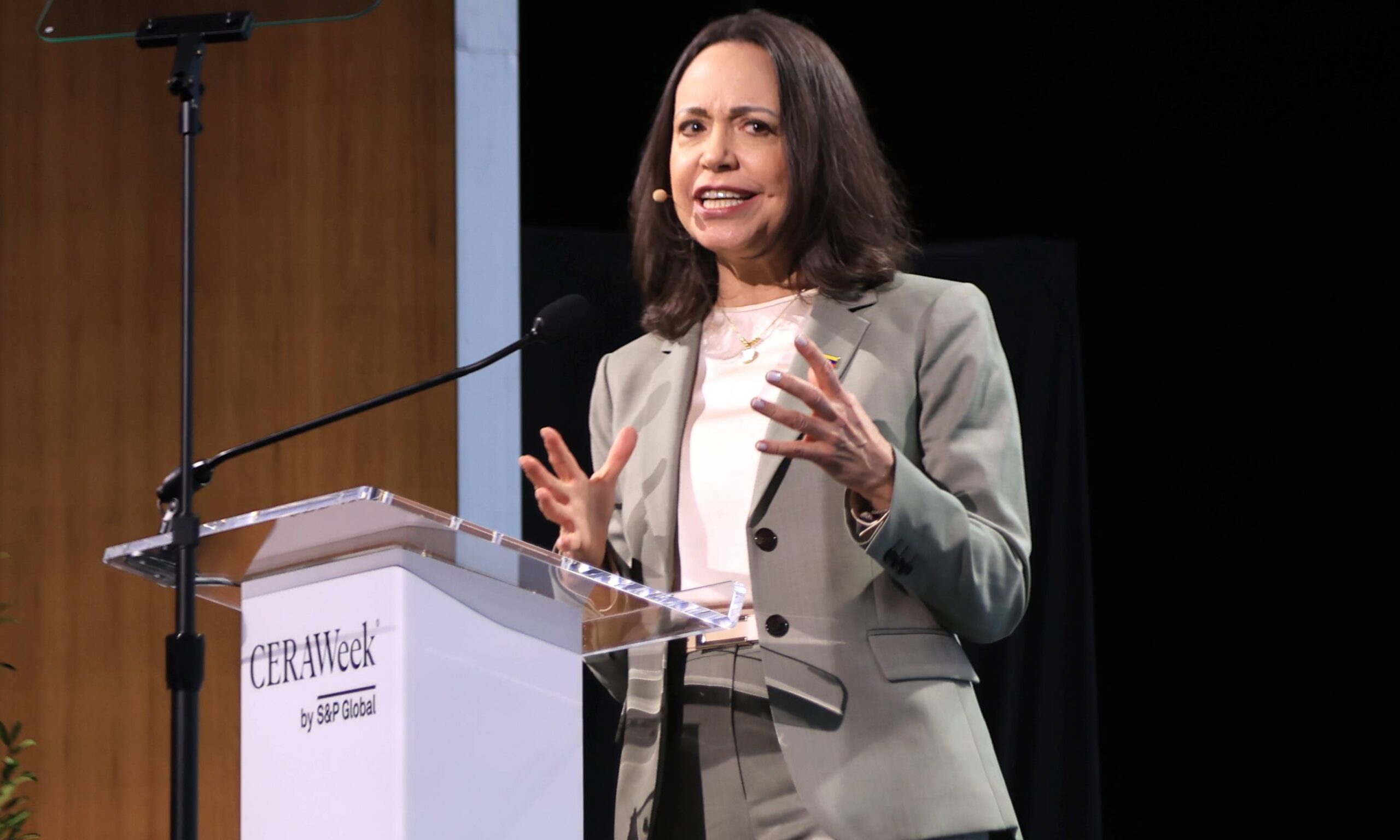 Maria Corina Machado presentó este martes 25 de marzo un plan energético para Venezuela ante decenas de empresarios petroleros estadounidenses en la conferencia CeraWeek, en Houston, Texas, en Estados UNidos, en la que destacó la intención de minimizar el rol estatal dentro de las inversiones petroleras del país y potenciar la presencia e inversión del sector privado.