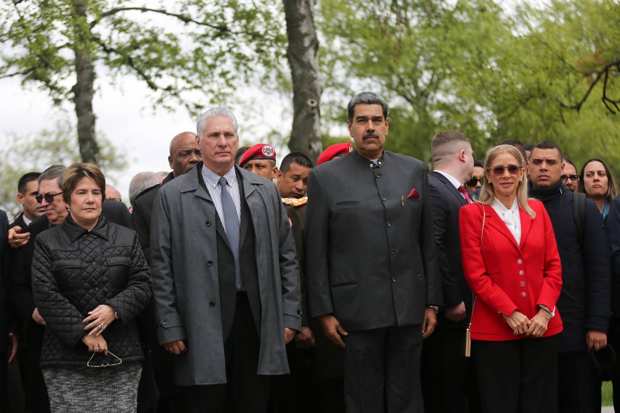 Nicolás Maduro y el presidente de Cuba, Miguel Díaz-Canel, rindieron homenaje a Simón Bolívar ante su estatua ubicada en Moscú, Rusia, este jueves 8 de mayo.