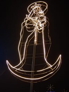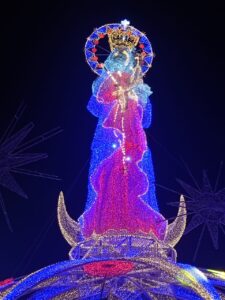 La emblemática figura de la Chinita de 25 metros ubicada en la Plaza El Ángel estrenó un manto de luces multicolores que formaban un tapiz wayuú, además de un rostro modificado por el artista plástico Leonardo López.