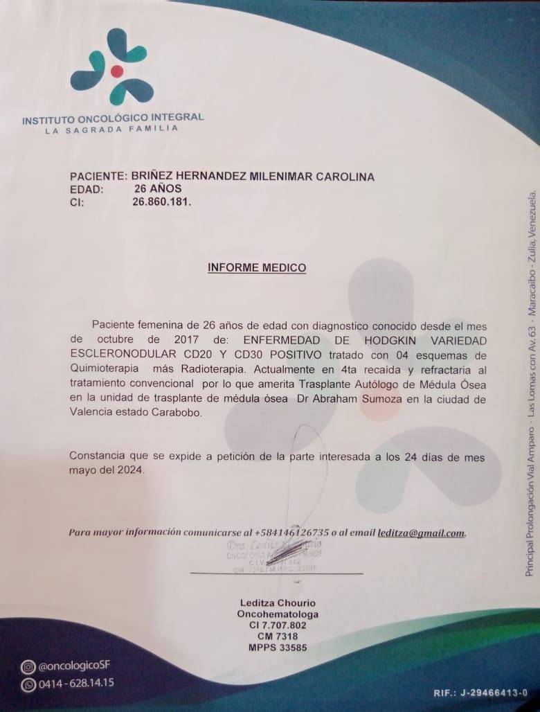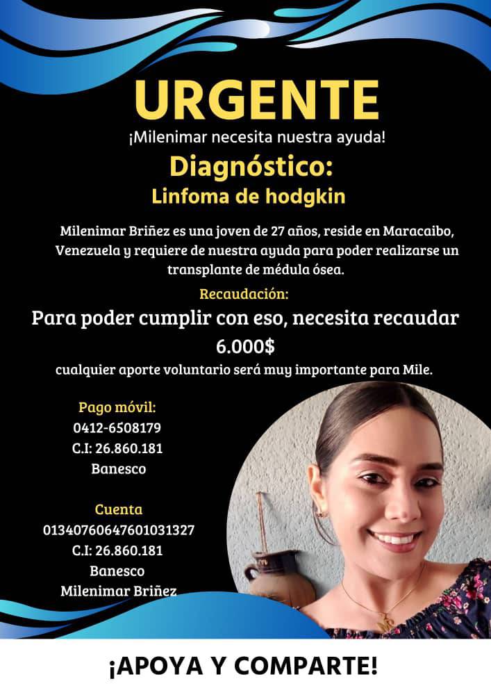 Melenimar Briñez, de 27 años, fue diagnosticada en 2017 con linfoma de Hodgkin (LH), variedad escleronodular CD20 y CD30, y actualmente necesita con urgencia un trasplante autólogo de médula ósea, para lo que requiere apoyo económico.