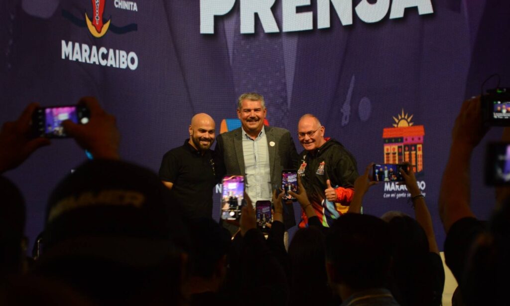 Omar Enrique, merenguero y presidente del Comité de la Feria Internacional de la Chinita, en compañía de Luis Caldera, gobernador del Zulia, y Giancarlo Di Martino, alcalde de Maracaibo, anunciaron este jueves 23 de octubre la lista de artistas invitados que se presentarán en el Amanecer de Feria, evento que estará dominado por merengueros y vallenateros.