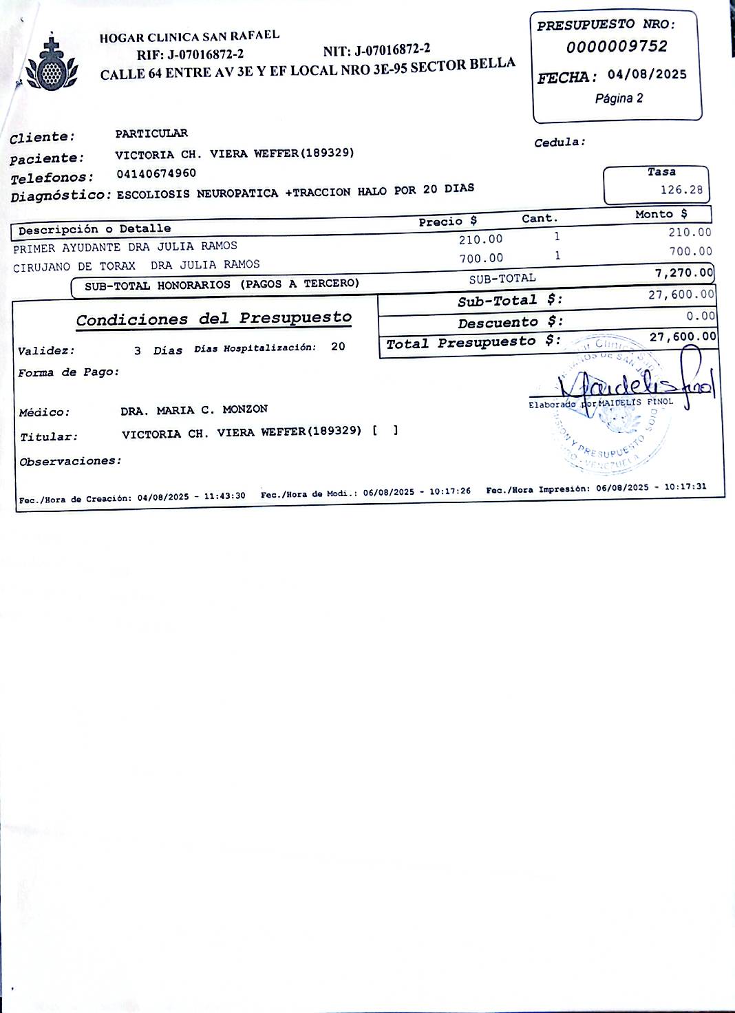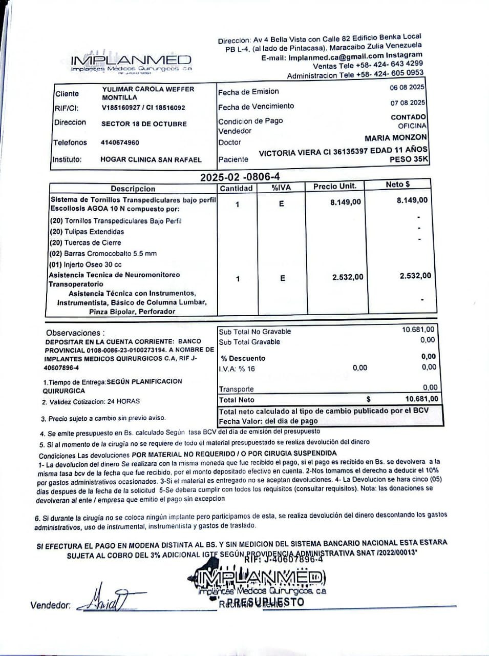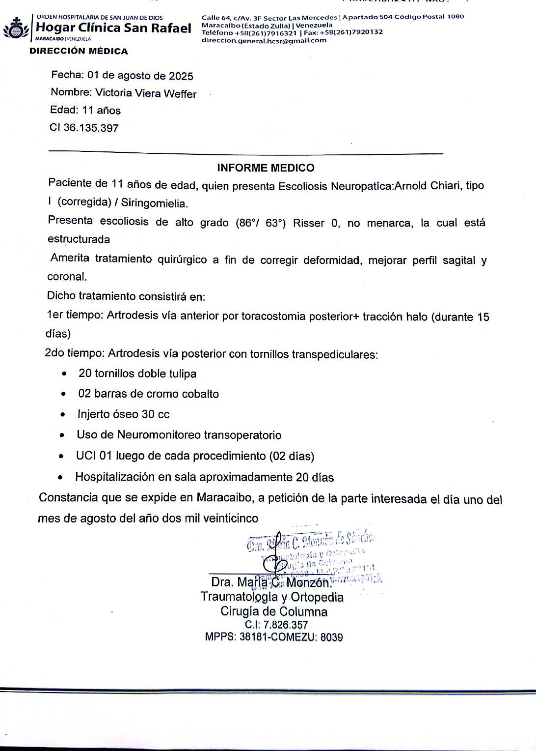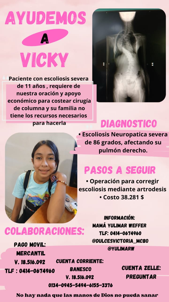 La pequeña Victoria Chiquinquirá Viera Weffer, una hermosa niña marabina de 11 años, fue diagnosticada desde los 3 años con escoliosis, es decir, una curvatura lateral anormal en forma de S de la columna vertebral.