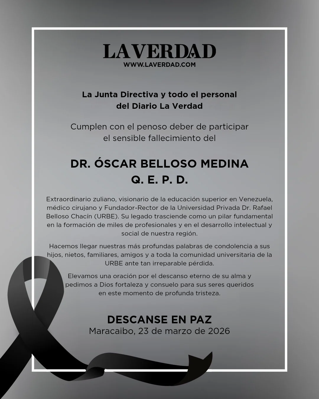 Hacemos llegar nuestras más profundas palabras de condolencia a sus hijos, nietos, familiares, amigos y a toda la comunidad universitaria de la URBE ante tan irreparable pérdida.