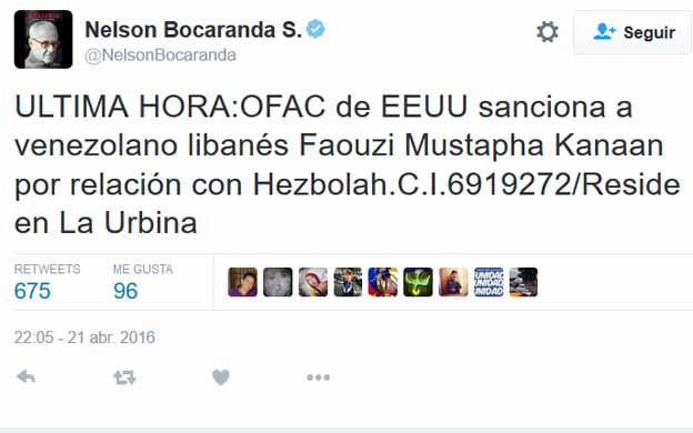 El periodista Nelson Bocaranda informó en su cuenta de Twitter sobre la sanción a un venezolano-libanés residente en Caracas, por parte de la Oficina de Control de Activos Extranjeros