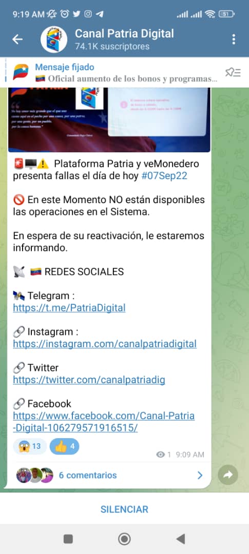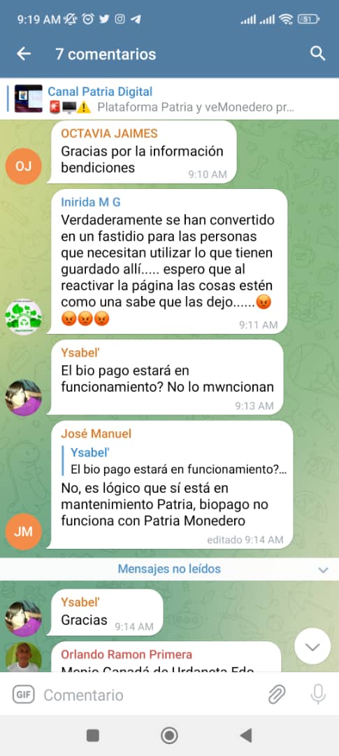 Así lo reportó en su cuenta de Telegram Canal Patria Digital, donde informó a sus usuarios que no podrán realizar retiros de fondos, transferencias, aceptación de bonos o pagos y actualización de datos.