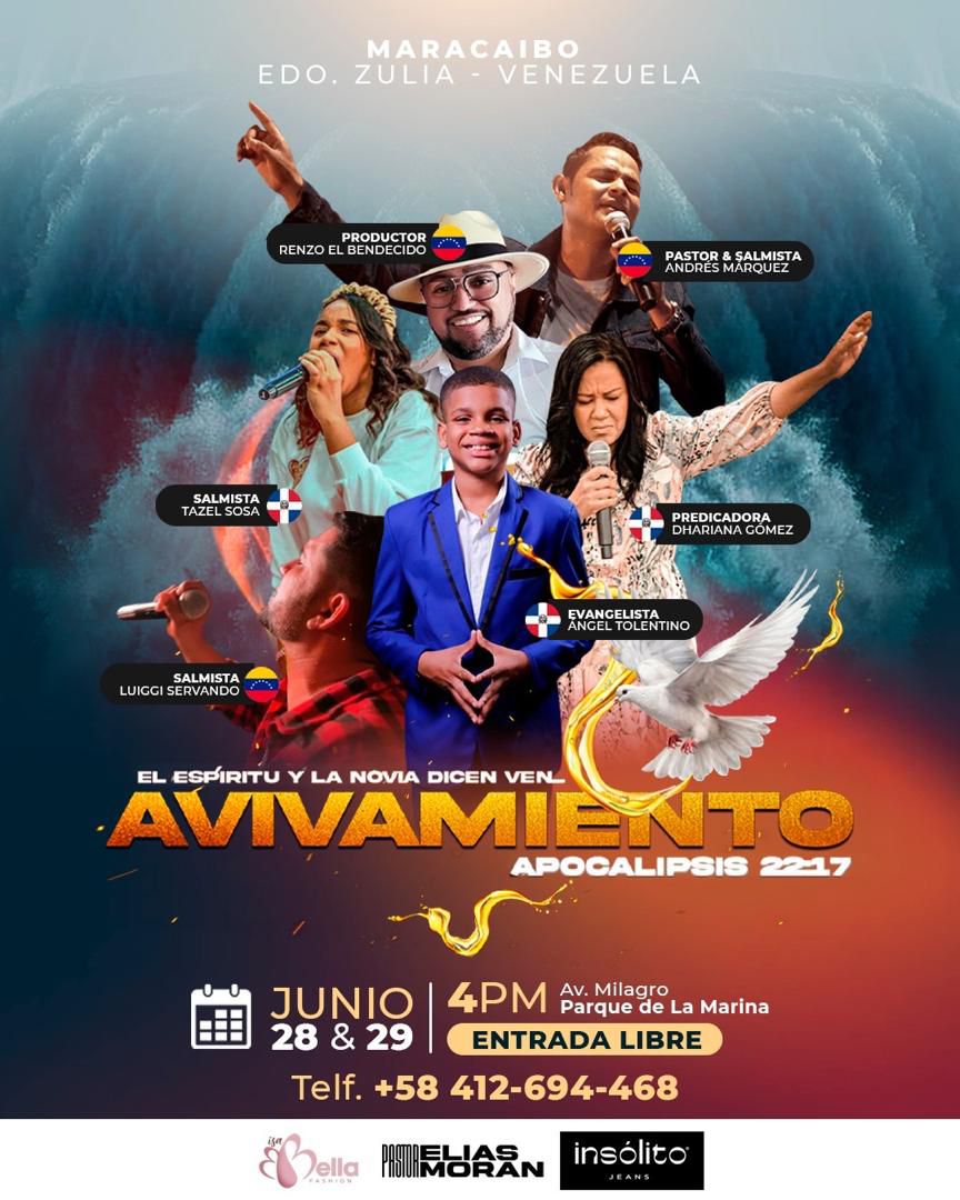 “El espíritu y la novia dicen ven: Avivamiento”, una actividad cristiana gratuita, se llevará a cabo los próximos 28 y 29 de junio en el Parque La Marina, en la avenida 2 de Milagro Norte, en Maracaibo, informaron el “profeta” Jhon Nacero y la coordinadora, Isabella Donado.