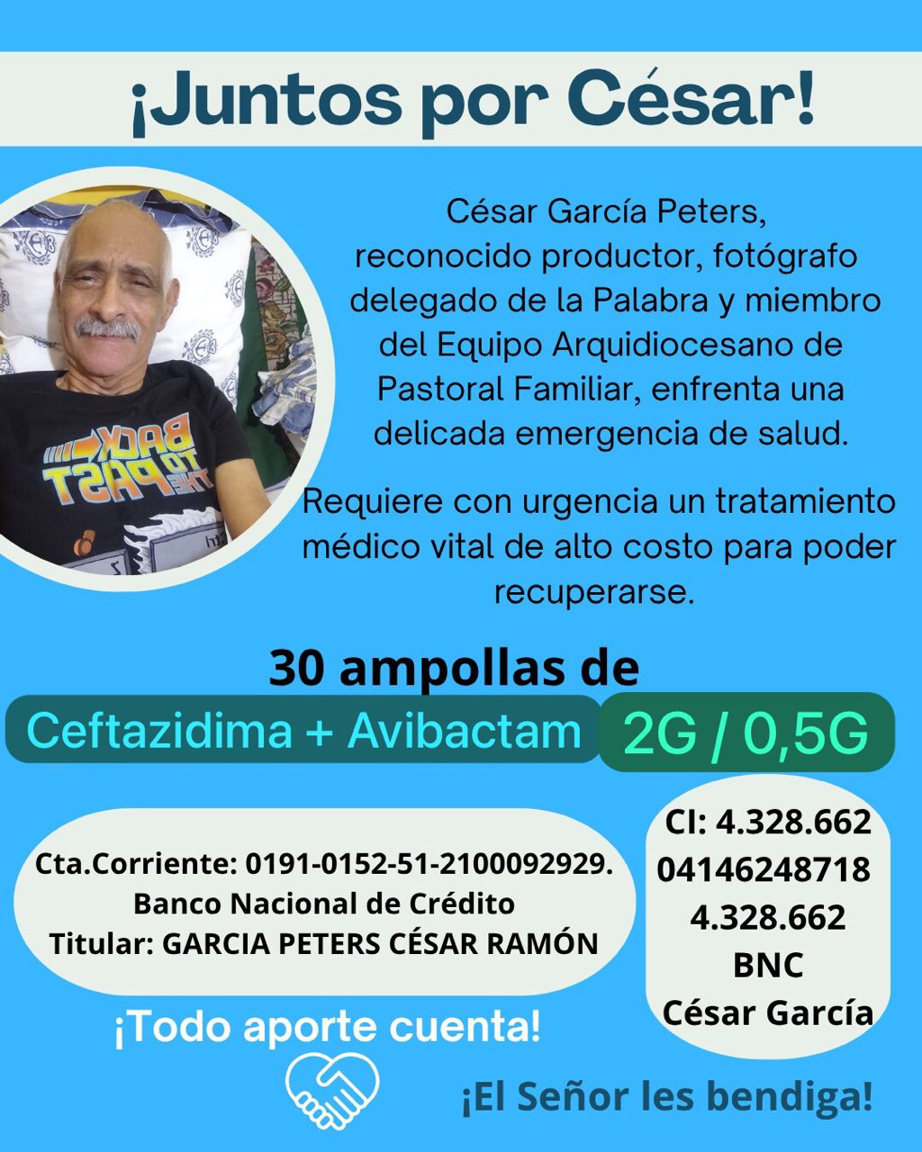 La salud de César Ramón García Peters se complicó y requiere con urgencia 30 ampollas del medicamento Ceftazidima + Avibactam 2G / 0,5G, vital para su recuperación.