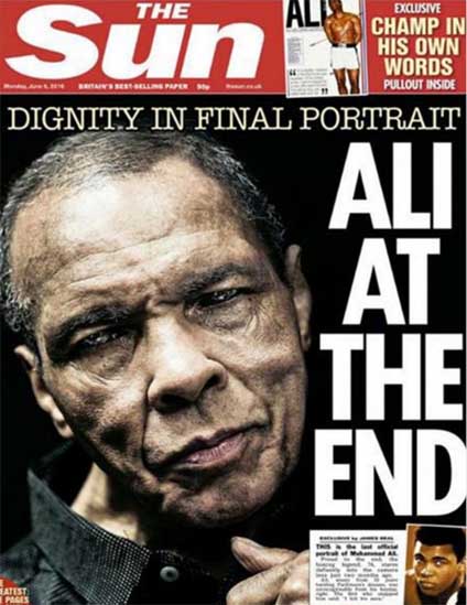El diario The Sun publicó en su portada una de las últimas fotos tomadas al tres veces campeón del mundo en los pesos pesados Muhammad Ali. Zenon Texeira, autor de la imagen describió como "irreconocible" el rostro del púgil