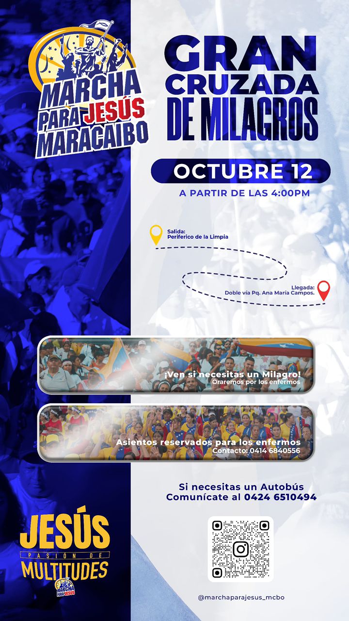 Para información sobre el transporte, los interesados deben comunicarse por el 0424-651-0494, para establecer contacto con los organizadores a través del 0414-684-0556 y para más detalles del evento revisar @marchaparajesus_mcbo.
