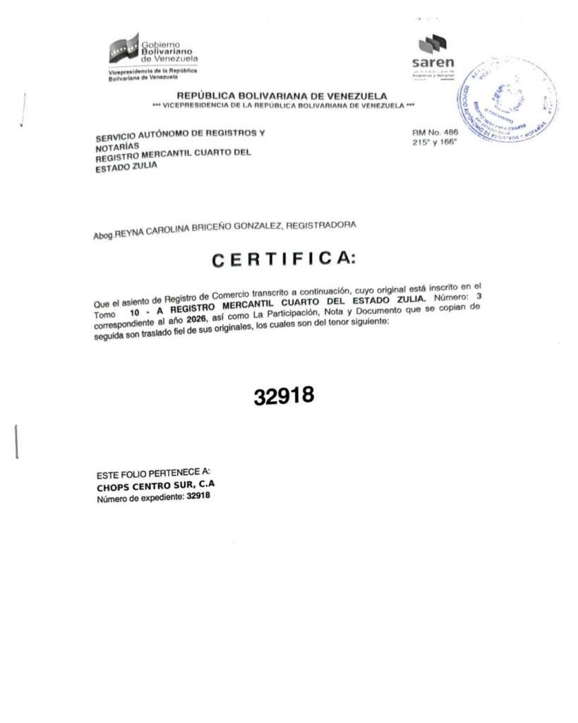 Registro Mercantil Chops Centro Sur, CA Expediente 32918