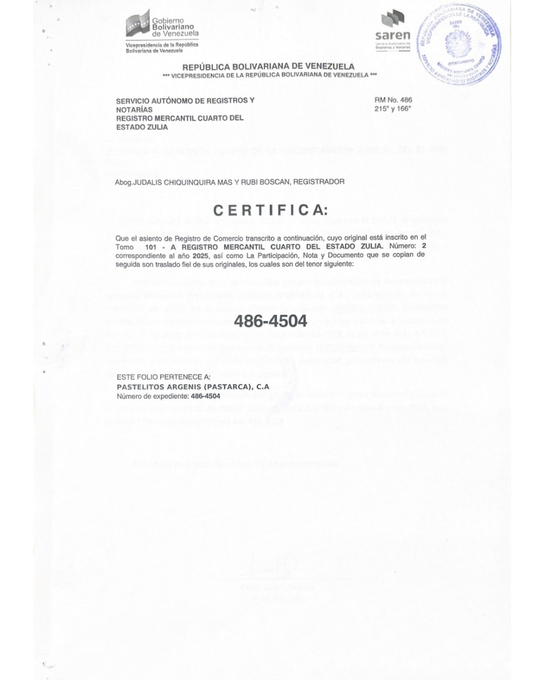 Registro Mercantil Pastelitos Argenis (PASTARCA) CA Expediente Nro 486-4504