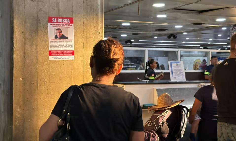 Carteles con la frase “Se busca” de órdenes de captura contra el aspirante presidencial Edmundo González Urrutia, exiliado en España, pueden verse este viernes 3 de enero en paredes y pantallas del Aeropuerto Internacional de Maiquetía Simón Bolívar, en Caracas.