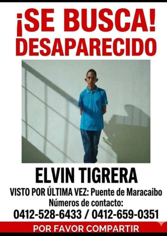 Elvin Rolando Tigrera Ocando, de 50 años, se encuentra desaparecido desde las 6.00 de la tarde de este domingo 15 de marzo. El hombre, quien tiene condiciones especiales, fue visto por última vez en la cabecera del Puente General Rafael Urdaneta, en el municipio San Francisco, en el estado Zulia.