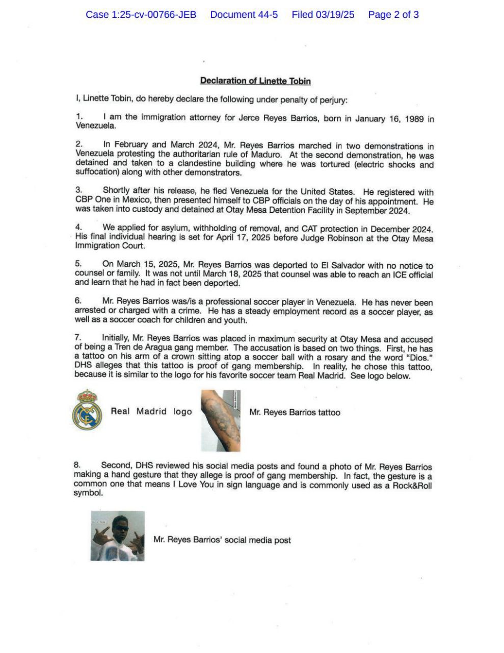 El venezolano Jerce Reyes Barrios, de 36 años, es un futbolista profesional y entrenador de fútbol juvenil al que el Gobierno de Estados Unidos deportó a la prisión del Centro de Confinamiento del Terrorismo (Cecot) en El Salvador el pasado 15 de marzo por tener un tatuaje del Real Madrid.