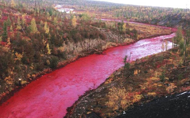 Grupos locales de defensa del medio ambiente difundieron fotografías en internet donde se puede ver el agua teñida de rojo sangre del río que cruza los bosques del gran norte ruso.