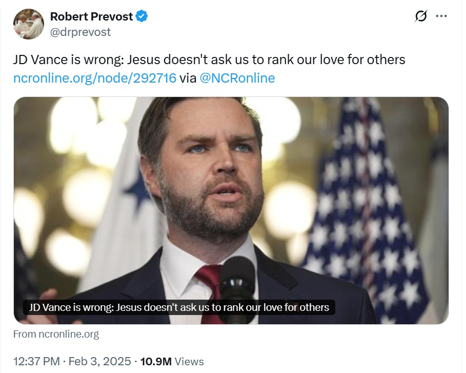 Poco antes, el 3 de febrero, el ahora papa León XIV, compartió un artículo de opinión de una periodista del National Catholic Reporter titulado, "JD Vance se equivoca: Jesús no nos pide que jerarquicemos nuestro amor por los demás", una crítica a lo dicho por el vicepresidente estadounidense, convertido al catolicismo, sobre la necesidad de preocuparse primero de la propia familia, poniendo por detrás a los que tenemos más lejos.
