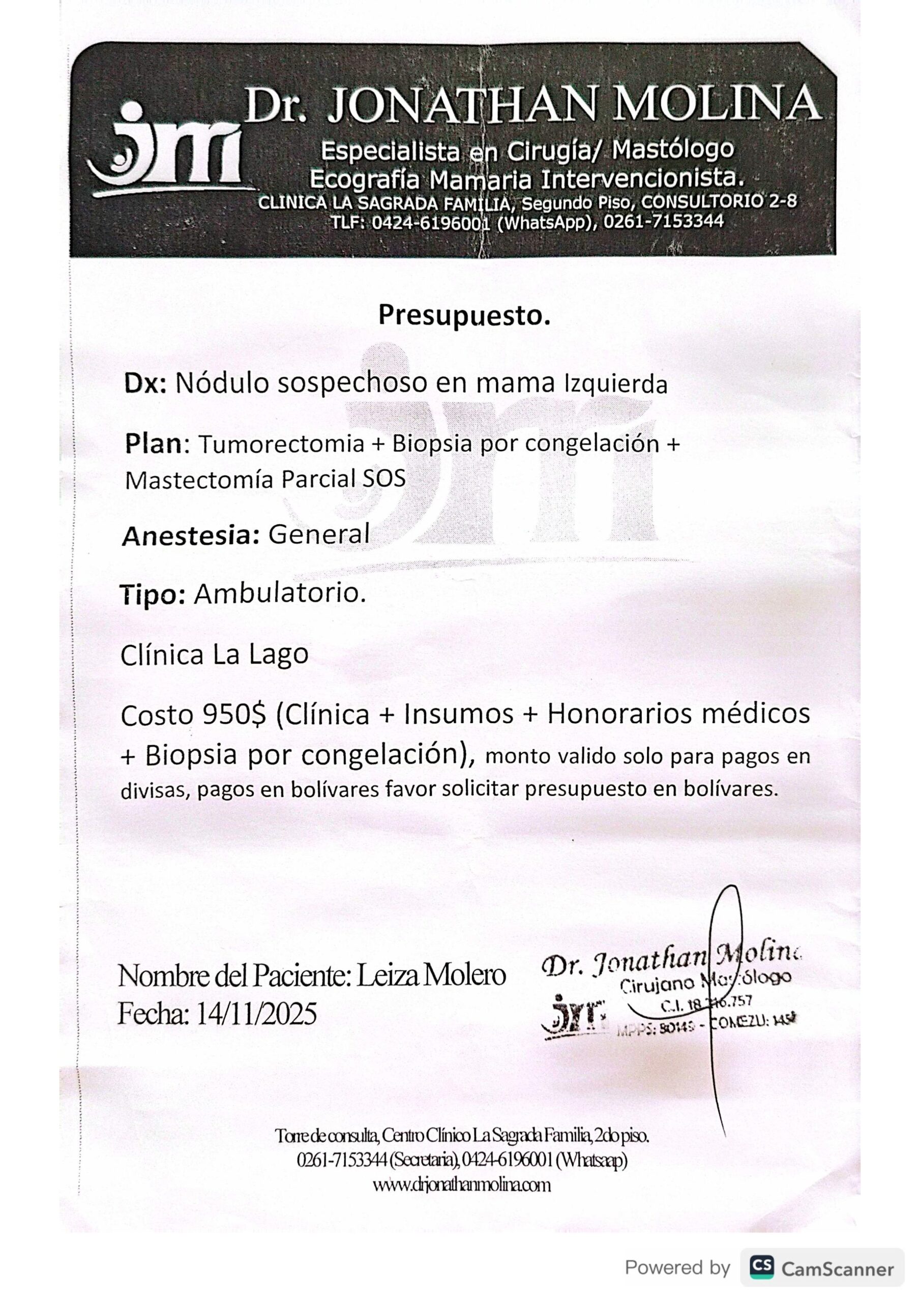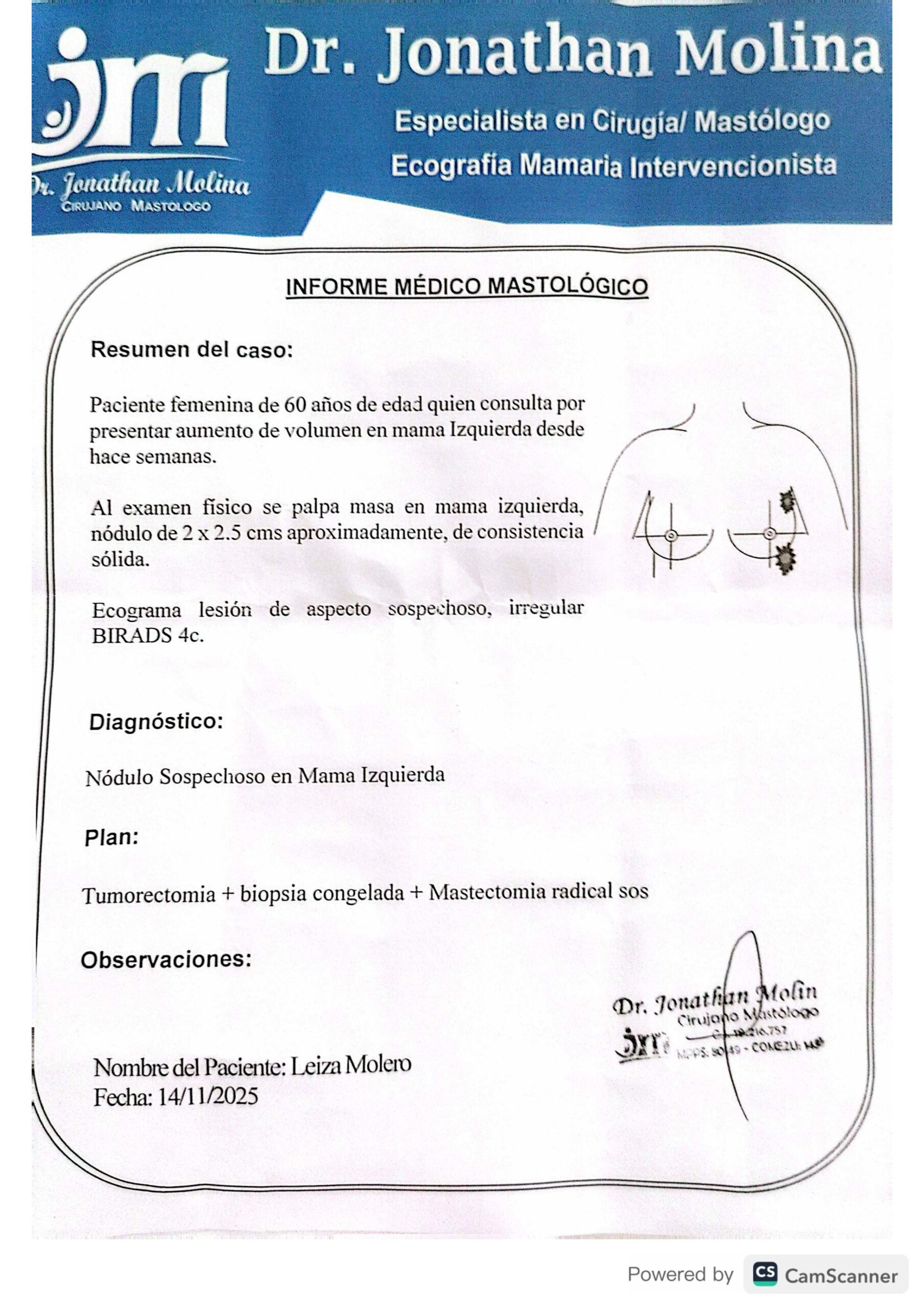 Leiza Molero, de 60 años, necesita realizarse una tumorectomía o extirpación de un nódulo en su mama izquierda y su familia no cuenta con los recursos económicos.