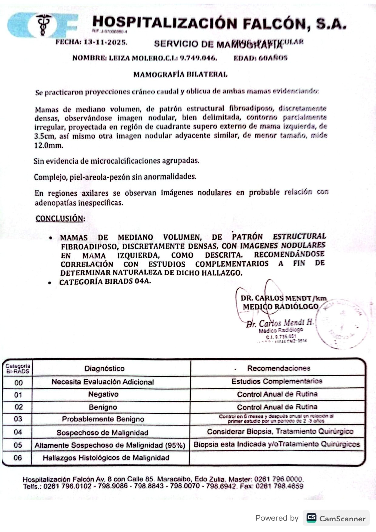 El diagnóstico médico revela que se trata de "un nódulo sospechoso", que requiere de una biopsia por congelación y una posible mastectomía parcial, según reveló su hermana Norma Molero al Diario La Verdad vía telefónica.