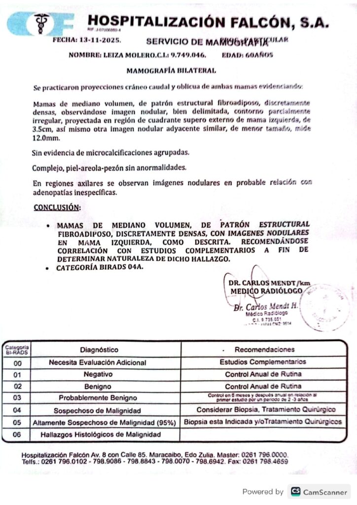 La señora Leiza Molero fue diagnosticada con "un nódulo sospechoso "en su mama izquierda, la cual requiere una tumorectomía y una biopsia por congelación