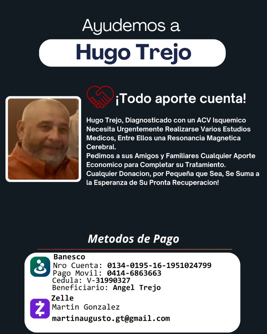Quienes deseen más información sobre el caso del señor Hugo pueden comunicarse con su esposa a través del número de teléfono +58 0424-666-0121 o a través de la cuenta de Instagram @hugotrejon.