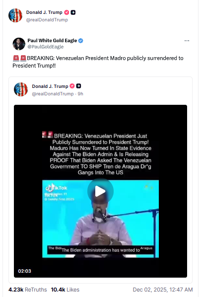 El presidente de los Estados Unidos, Donald Trump, compartió la madrugada de este martes 2 de diciembre un video en redes sociales en el que se afirma que “Nicolás Maduro se rinde públicamente” ante él.