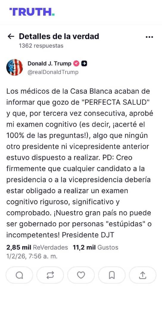 "Los médicos de la Casa Blanca acaban de informar que gozo de 'PERFECTA SALUD' y que obtuve una calificación perfecta (es decir, respondí correctamente al 100 % de las preguntas) en mi examen cognitivo por tercera vez consecutiva, algo que ningún otro presidente ni vicepresidente anterior estuvo dispuesto a hacer", informó, en un mensaje publicado en su red Truth Social.
