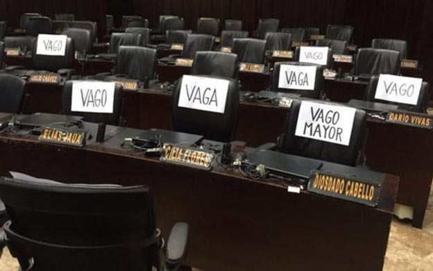 Luego de que la bancada chavista de la Asamblea Nacional abanadonara la sesión de este jueves argumentando que la directiva opositora violó el reglamento de interior y debate, al no contar con el quórum requerido para sesionar la hora establecida en la convocatoria, los diputados de la Mesa de la Unidad Democrática (MUD) procedieron a pegar carteles en las sillas de sus contrincantes con las palabras "Vago" y "Vaga".