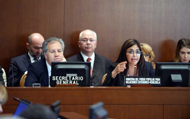 "Desde Venezuela no vamos a permitir que ningún país, y lo voy a decir con nombre y apellido, Estados Unidos, sirviéndose de la Secretaría general (de la OEA) y de factores violentos en Venezuela pretenda la intervención de nuestra patria'', dijo la Rodríguez durante una sesión extraordinaria que su Gobierno solicitó al Consejo Permanente de la OEA. Almagro permaneció inexpresivo durante el discurso, el cual escuchó sentado exactamente junto a la canciller.